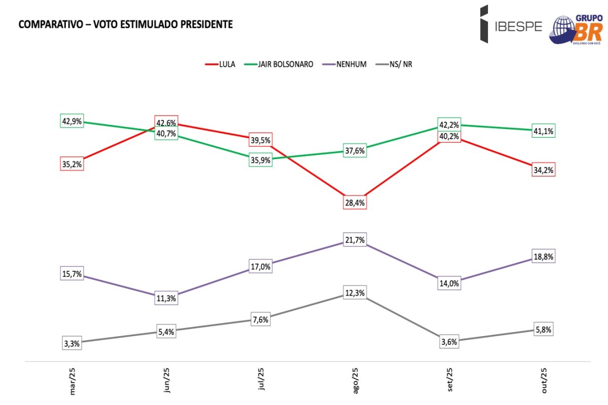 Em relação ao levantamento anterior, de setembro, a diferença a favor de Bolsonaro aumentou — não porque ele tenha crescido, mas porque Lula caiu mais. O presidente passou de 40,2% para 34,2%, enquanto Bolsonaro manteve-se praticamente estável. Já a parcela dos que dizem “nenhum” nesse cenário subiu de 14% para 18,8%.